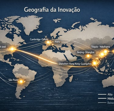 Descubra a geografia da inovação em 2026: clusters dominantes como Shenzhen e Vale do Silício concentram VC e patentes. Análise estratégica para investidores com dados do GII WIPO e WEF. Identifique oportunidades em ecossistemas emergentes.